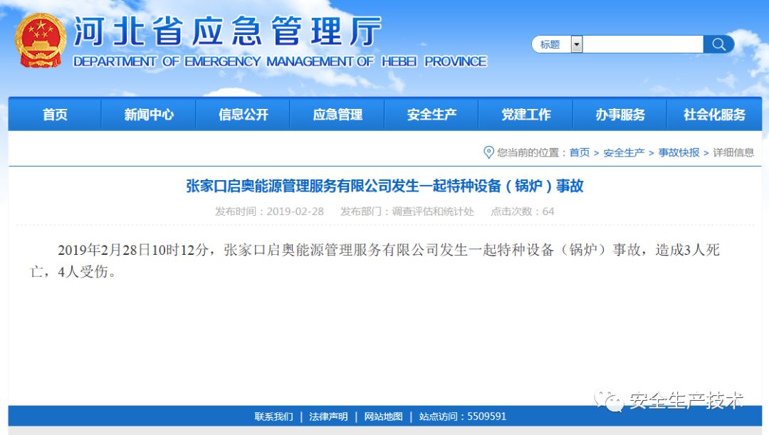 2019年2月28日上午10时12分左右,张家口市察北管理区启奥能源管理服务有限公司1台15蒸吨生物质锅炉发生上锅筒管孔区撕裂事故,共造成3人死亡7人受伤。目前伤者正在医院进行救治,事故原因正在调查,善后处置工作正在有序开展。