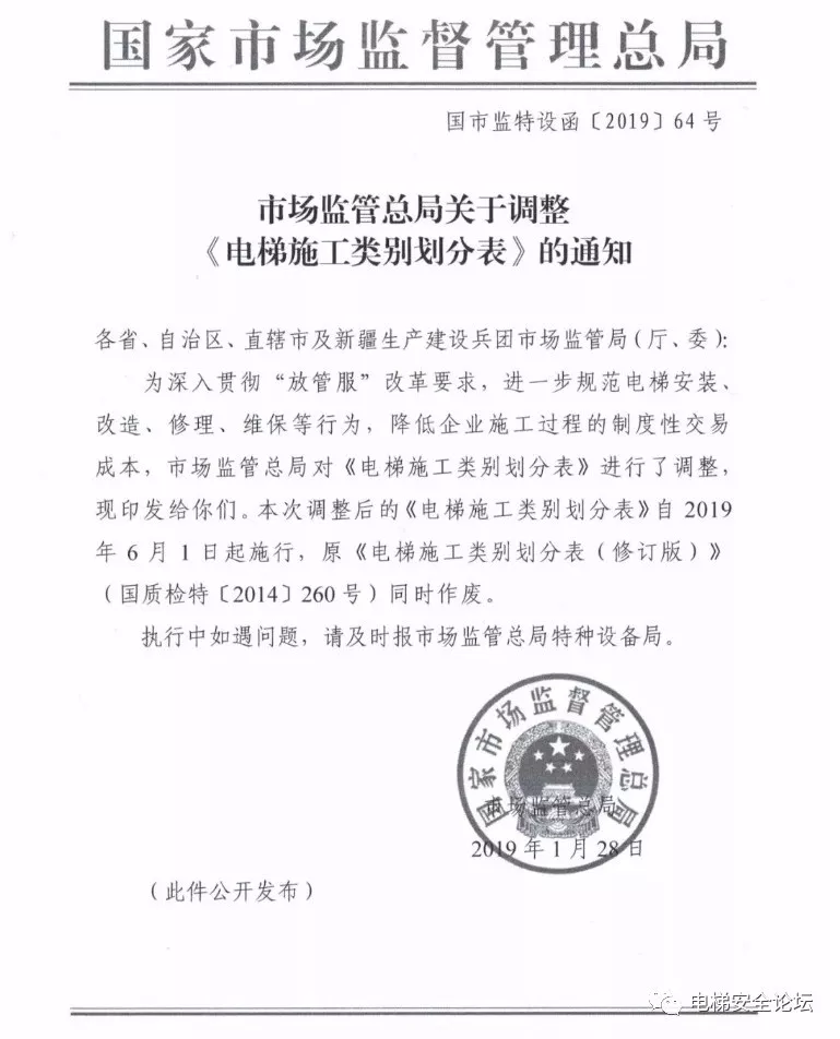 为了帮助行业同仁更方便掌握调整内容,名义作者就帮大家做一番简单梳理。 将新发布的《电梯施工类别划分表》(国市监特设函〔2019〕64号)(国市监特设函〔2019〕64号)和2014年发布的《电梯施工类别划分表》(修订版)(国质检特〔2014〕260号)进行对照,对调整情况进行了汇总,对于有变化的地方提出了自己的看法,希望对大家有所帮助。