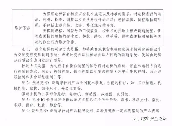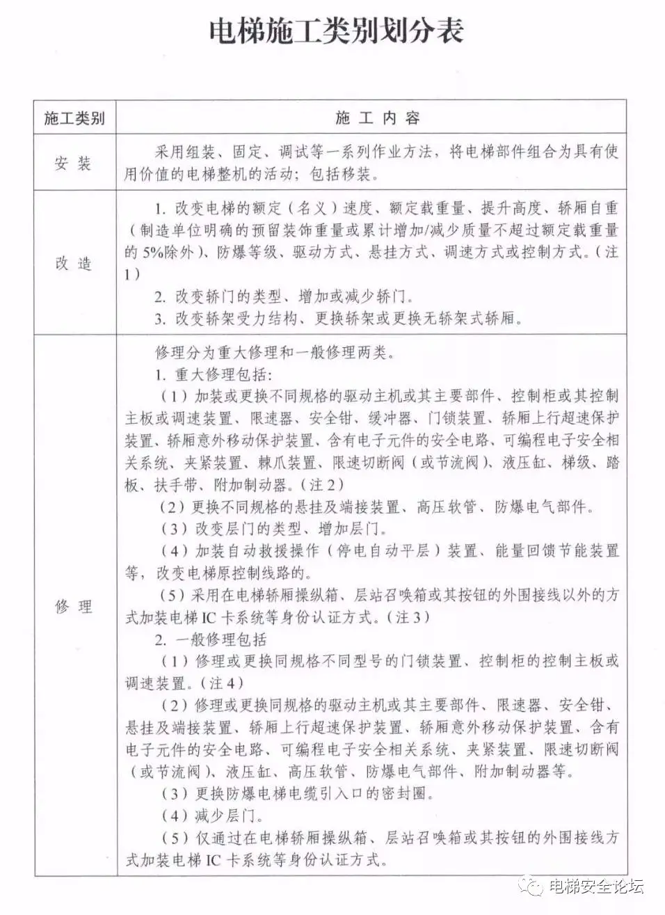 二、调整前后的对比表 电梯施工类别划分调整前后对比表 施工类别 | 施 工 内 容 | 调整前 | 调整后 | 安 装 | 采用组装、固定、调试等一系列作业方法,将电梯部件组合为具有使用价值的电梯整机的活动;包括移装。 | 改 造 | 采用更换、调整、加装等作业方法,改变原电梯主要受力结构、机构(传动系统)或控制系统,致使电梯性能参数与技术指标发生改变的活动;包括: 1. 改变电梯的额定(名义)速度、额定载重量、提升高度、轿厢自重(制造单位明确的预留装饰重量除外)、防爆等级、驱动方式、悬挂方式、调速方式以及控制方式(注1); 2. 加装或更换不同规格、不同型号的驱动主机、控制柜、限速器、安全钳、缓冲器、门锁装置、轿厢上行超速保护装置、轿厢意外移动保护装置、含有电子元件的安全电路及可编程电子安全相关系统、夹紧装置、棘爪装置、限速切断阀(或节流阀)、液压缸、梯级、踏板、扶手带、附加制动器(注2); 3. 改变层(轿)门的类型、增加层门或轿门; 4. 加装自动救援操作(停电自动平层)装置、能量回馈节能装置、读卡器(IC卡)等,改变电梯原控制线路。 | 1. 改变电梯的额定(名义)速度、额定载重量、提升高度、轿厢自重(制造单位明确的预留装饰重量或累计增加/减少质量不超过额定载重量的5%除外)、防爆等级、驱动方式、悬挂方式、调速方式或控制方式(注1); 2. 改变轿门的类型、增加或减少轿门。 3.改变轿架受力结构、更换轿架或更换无轿架式轿厢。 | 修 理 | 用新的零部件替换原有的零部件,或者对原有零部件进行拆卸、加工、修配,但不改变电梯的原性能参数与技术指标的活动。修理分为重大修理和一般修理两类。 1. 重大修理包括: (1)更换同规格的驱动主机及其主要部件(如电动机、制动器、减速器、曳引轮); (2)更换同规格的控制柜; (3)更换不同规格的悬挂及端接装置、高压软管、防爆电气部件; (4)更换防爆电梯电缆引入口的密封圈。 2. 一般修理包括修理和更换下列部件(保持原规格)实施的作业:门锁装置、控制柜的控制主板和调速装置、限速器、安全钳、缓冲器、悬挂及端接装置、轿厢上行超速保护装置、轿厢意外移动保护装置、含有电子元件的安全电路及可编程电子安全相关系统、夹紧装置、棘爪装置、限速切断阀(或节流阀)、液压缸、高压软管、防爆电气部件、梯级、踏板、扶手带、附加制动器等。 | 修理分为重大修理和一般修理两类。 1. 重大修理包括: (1)加装或更换不同规格的驱动主机或及其主要部件(如电动机、制动器、减速器、曳引轮)、控制柜或其控制主板或调速装置、限速器、安全钳、缓冲器、门锁装置、轿厢上行超速保护装置、轿厢意外移动保护装置、含有电子元件的安全电路、可编程电子安全相关系统、夹紧装置、棘爪装置、限速切断阀(或节流阀)、液压缸、梯级、踏板、扶手带、附加制动器(注2); (2)更换不同规格的悬挂及端接装置、高压软管、防爆电气部件; (3)改变层门的类型、增加层门; (4)加装自动救援操作(停电自动平层)装置、能量回馈节能装置等,改变电梯原控制线路。 (5)采用在电梯轿厢操纵箱、层站召唤箱或其按钮的外围接线以外的方式加装IC卡系统等身份认证方式(注3)。 2. 一般修理包括 (1)修理或更换同规格不同型号的门锁装置、控制柜的控制主板或调速装置; (2)修理或更换下列部件(保持原规格)实施的作业:驱动主机或其主要部件、限速器、安全钳、悬挂及端接装置、轿厢上行超速保护装置、轿厢意外移动保护装置、含有电子元件的安全电路、可编程电子安全相关系统、夹紧装置、限速切断阀(或节流阀)、液压缸、高压软管、防爆电气部件、附加制动器等; (3)更换防爆电梯电缆引入口的密封圈。 (4)减少层门; (5)采用在电梯轿厢操纵箱、层站召唤箱或其按钮的外围接线的方式加装IC卡系统等身份认证方式。 | 维护保养 | 为保证电梯符合相应安全技术规范以及标准的要求,对电梯进行的清洁、润滑、检查、调整以及更换易损件的活动;包括裁剪、调整悬挂钢丝绳,不包括上述安装、改造、修理规定的内容。 更换同规格、同型号的门锁装置、控制柜的控制主板和调速装置、缓冲器、梯级、踏板、扶手带、围裙板等实施的作业视为维护保养。 | 为保证电梯符合相应安全技术规范以及标准的要求,对电梯进行的清洁、润滑、检查、调整以及更换易损件的活动;包括裁剪、调整悬挂钢丝绳,不包括上述安装、改造、修理规定的内容。 更换同规格、同型号的控制柜的控制主板或调速装置、门锁装置,修理或更换缓冲器、梯级、踏板、扶手带、围裙板、棘爪装置等实施的作业视为维护保养。 |